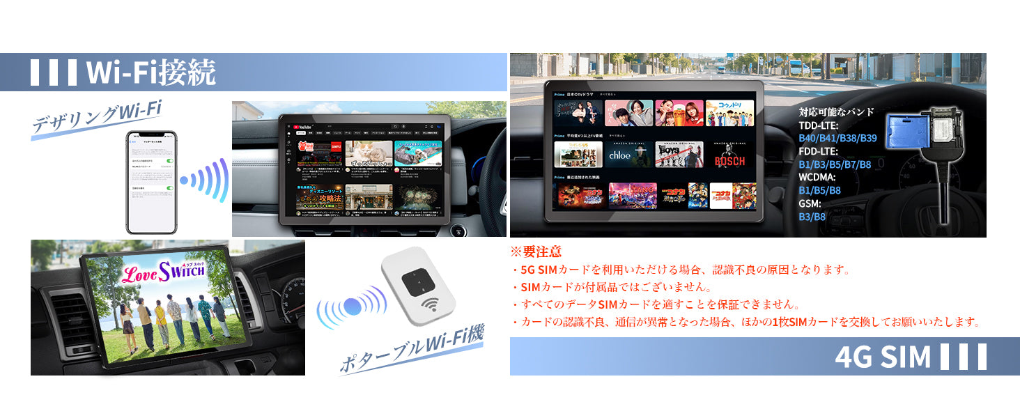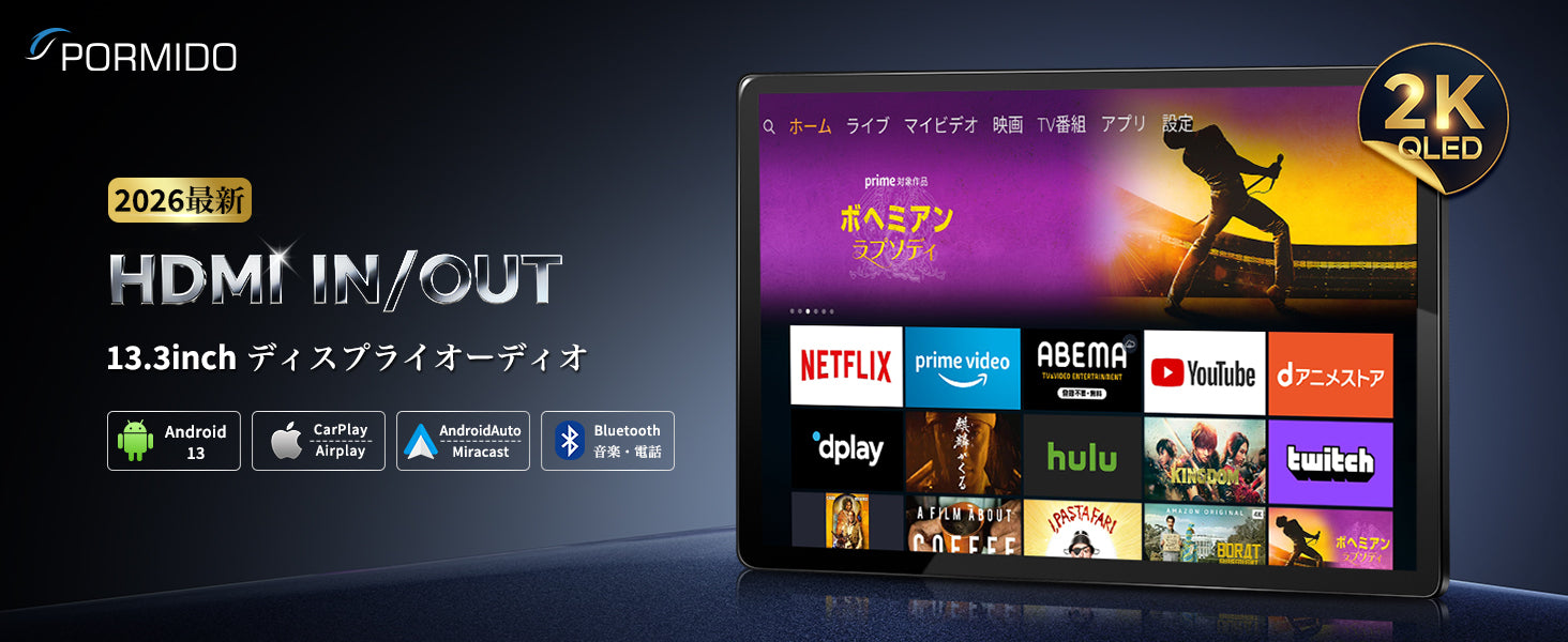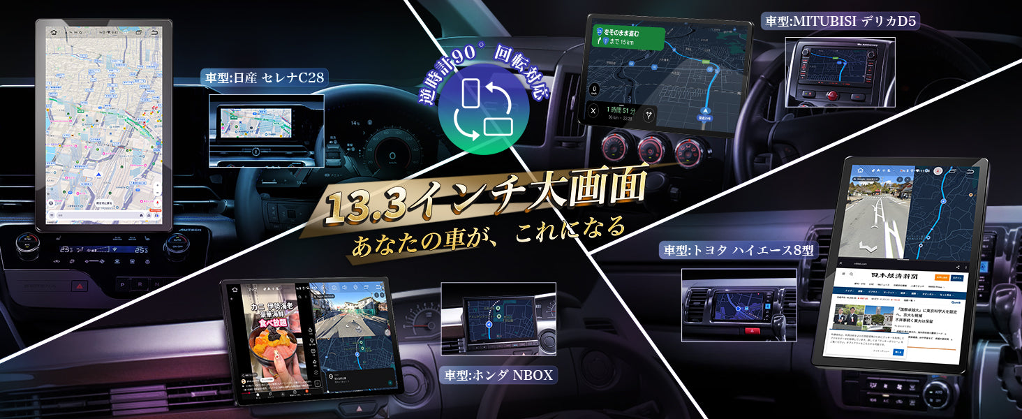ワイヤレスミラーリング(Airplay/Miracast):同乗者のスマホ画面を13.3インチの大画面に映し出し、お気に入りの動画を簡単にシェアできます。
