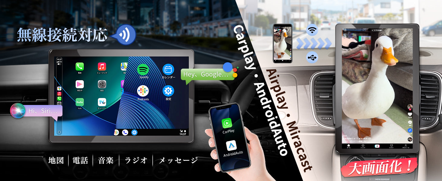 - ワイヤレスCarPlay/Android Auto対応:スマホをポケットに入れたまま、ナビ、音楽、電話を一元管理。配線不要で車内がスッキリまとまり、車載のワイヤレス充電器との併用も快適です。