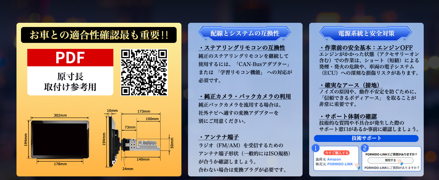 本製品【PRA109B】は車種によって取り付け可否が異なります。ご購入前に必ず純正ナビとの互換性、設置スペースのサイズをご確認ください。ナビゲーションは精密機器のため、お取り付けに関しては専門店へのご相談をおすすめします。ご購入後は12ヶ月メーカー保証&日本語の安心サポート付きで、万一の不具合も専門スタッフが迅速に対応いたします。末永く快適なカーライフをお楽しみください。