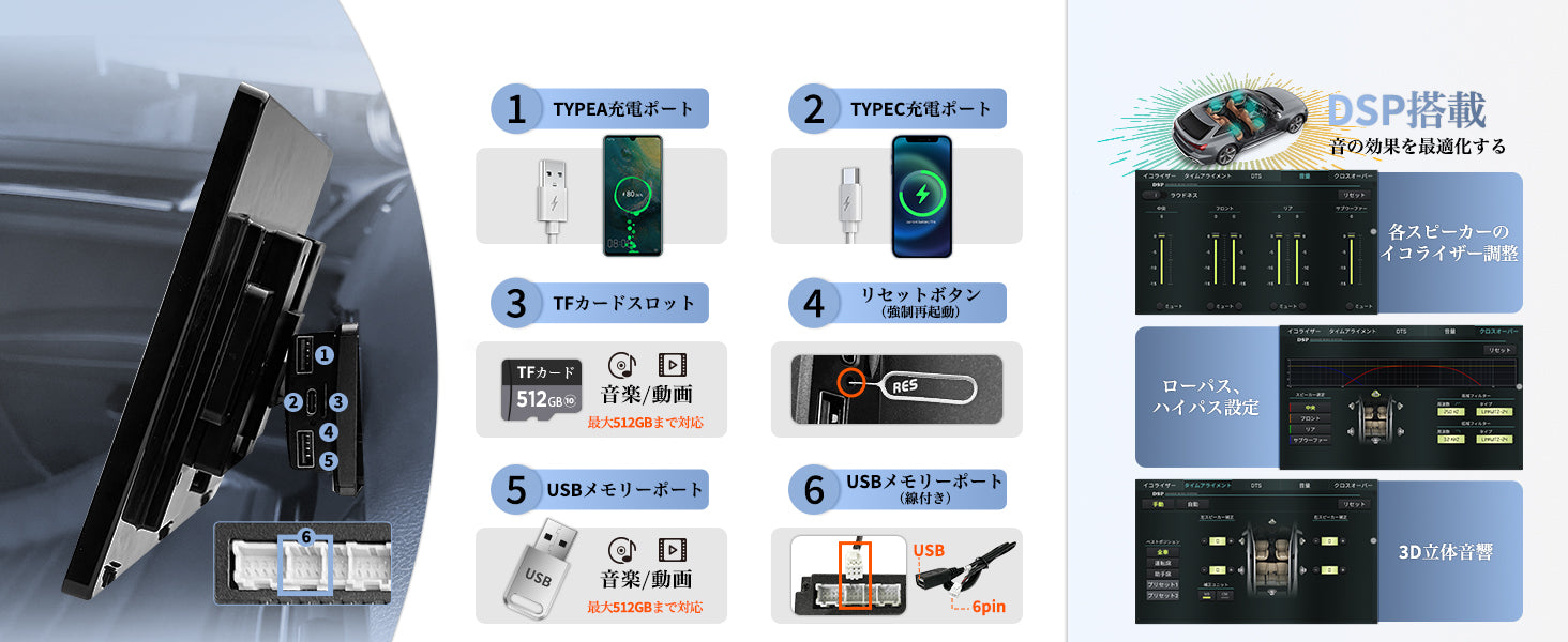 USBメディア再生:事前にダウンロードした動画や音楽データをUSBメモリに入れておけば、電波状況を気にせずオフラインでノンストップ再生が可能です。
