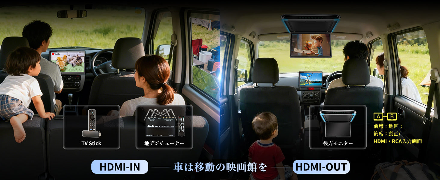 最新のHDMI-INとHDMI-OUTの同時利用に対応し、車内のエンターテインメント性を極限まで高めました。駐車中のスキマ時間にはHDMI-INでゲーム機や動画配信デバイスを接続して車内をシアターに。ドライブ中はHDMI-OUTを活用し、前席でナビを確認しながら後席のモニターで動画を再生することが可能です。お子様の退屈しのぎにも最適で、家族ドライブがさらに楽しくなります。