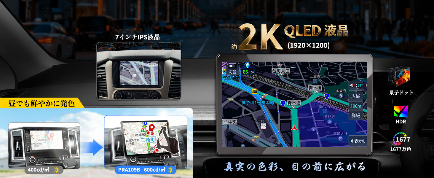約2K(1920x1200)の高解像度QLED液晶パネルを搭載。1677万色の発色と広色域(WCG)により、地図や動画が驚くほど鮮明に表示され、長時間の運転でも視覚的に疲れません。さらに、車内空間に合わせて画面を縦横自由に回転可能。BBAなどの縦長センタースペースには縦画面で純正品のような高級感を、プリウスやハイエースなどの横長スペースには横画面で広々とした視野を確保し、視認性と操作性を最適化します。