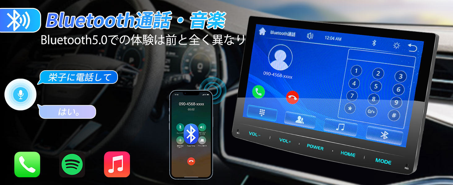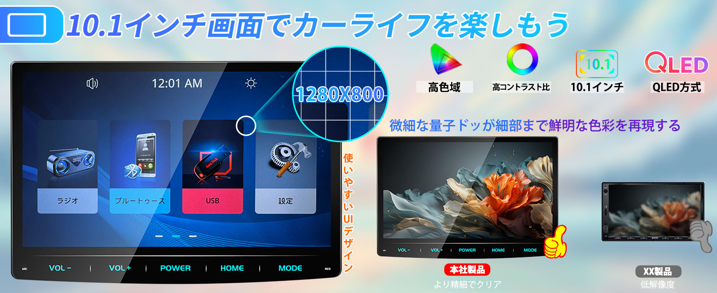 当該製品はカーオーディオの必要となる四つ機能が搭載して、従来の有線接続のみ型を突破し、ワイヤレス&有線まで進化しました。煩雑な配線という悩みから解放、スマホ側で接続操作をし接続したら、ナビゲーションや音楽再生、通話等のアプリを使用できます。 - 1280X800pixel高精細解像度QLEDタッチスクリーン