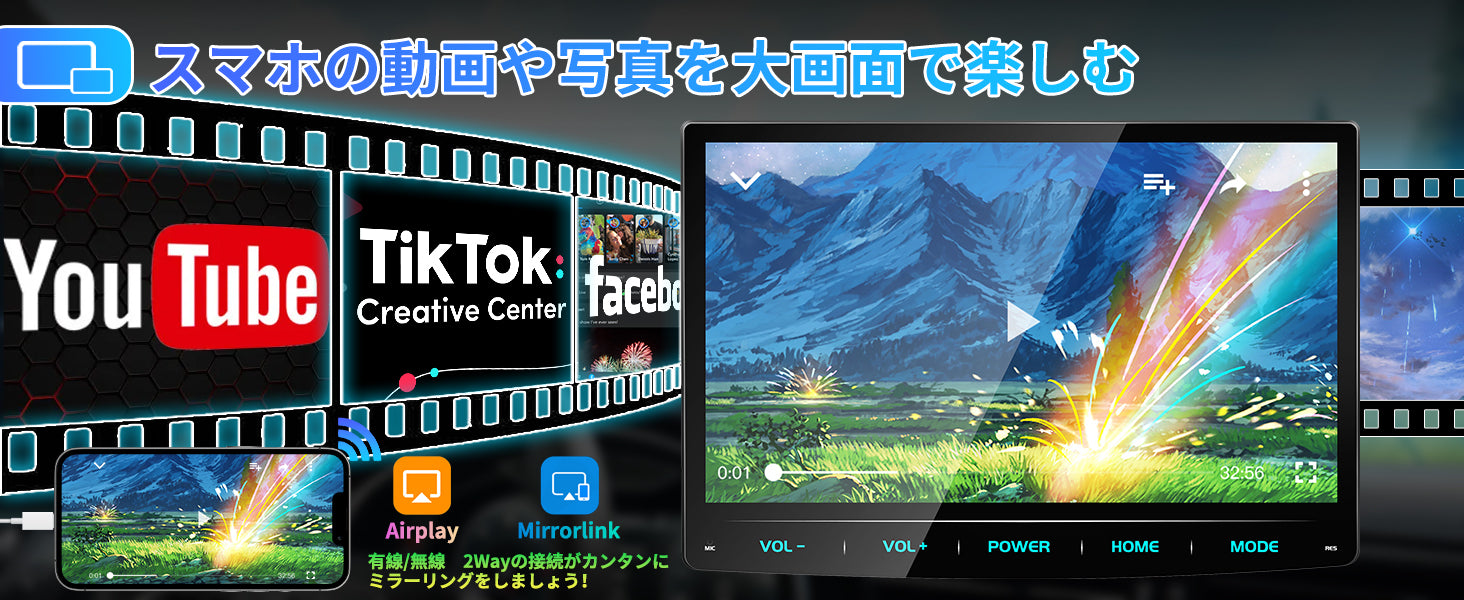 - ワイヤレス&有線CarPlay/AndroidAuto Mirrorlink/AirPlay対応